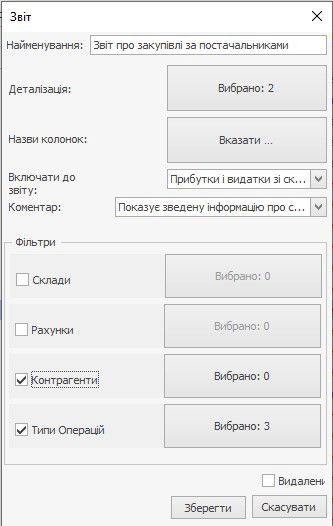 Побудова власного звіту має низку нюансів, тому під час його створення можна скористатися одним з наявних (їх список відкривається під час виборі пункту меню). Для цього потрібно вибрати найбільш підходящий за набором параметрів звіт і натиснути кнопку Копіювати. Відкриється вікно завдання параметрів звіту.