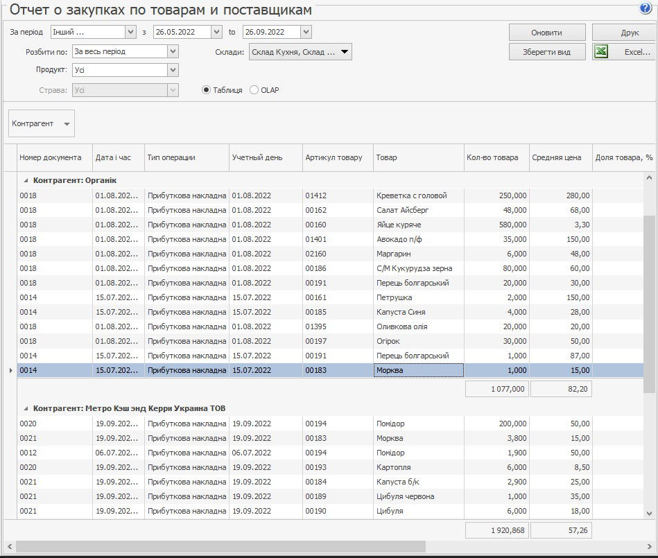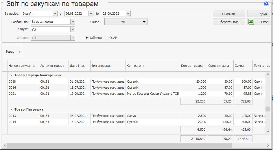 Для формування звіту натисніть кнопку Показати або двічі натисніть ліву кнопку миші на відповідному до звіту рядку. Задайте Звітний період і натисніть кнопку Оновити. Ми бачимо список товарів із зазначенням його ціни, кількості та суми, а також постачальника.