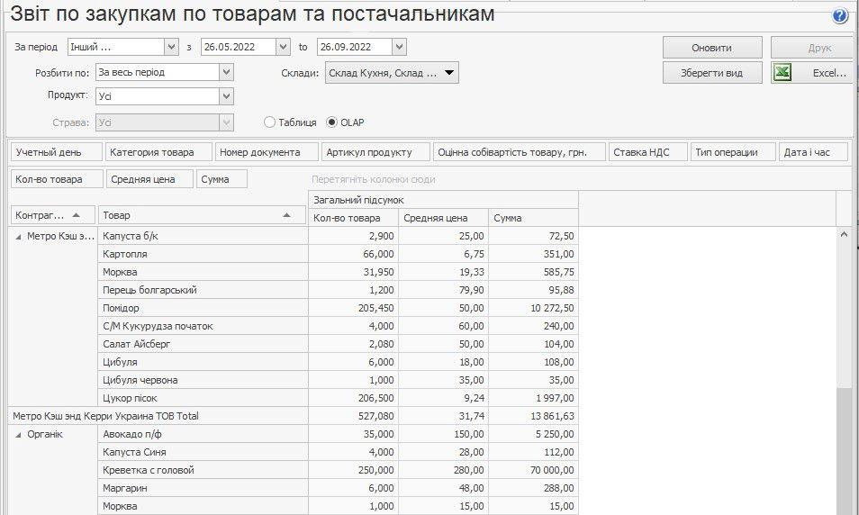 Ви хочете оптимізувати транспортні витрати. І вам потрібна інформація про те, який асортимент надає постачальник. Для цього деталізуйте Звіт про закупівлі за постачальниками за параметрами Група товару, Категорія товару та Інгредієнт.