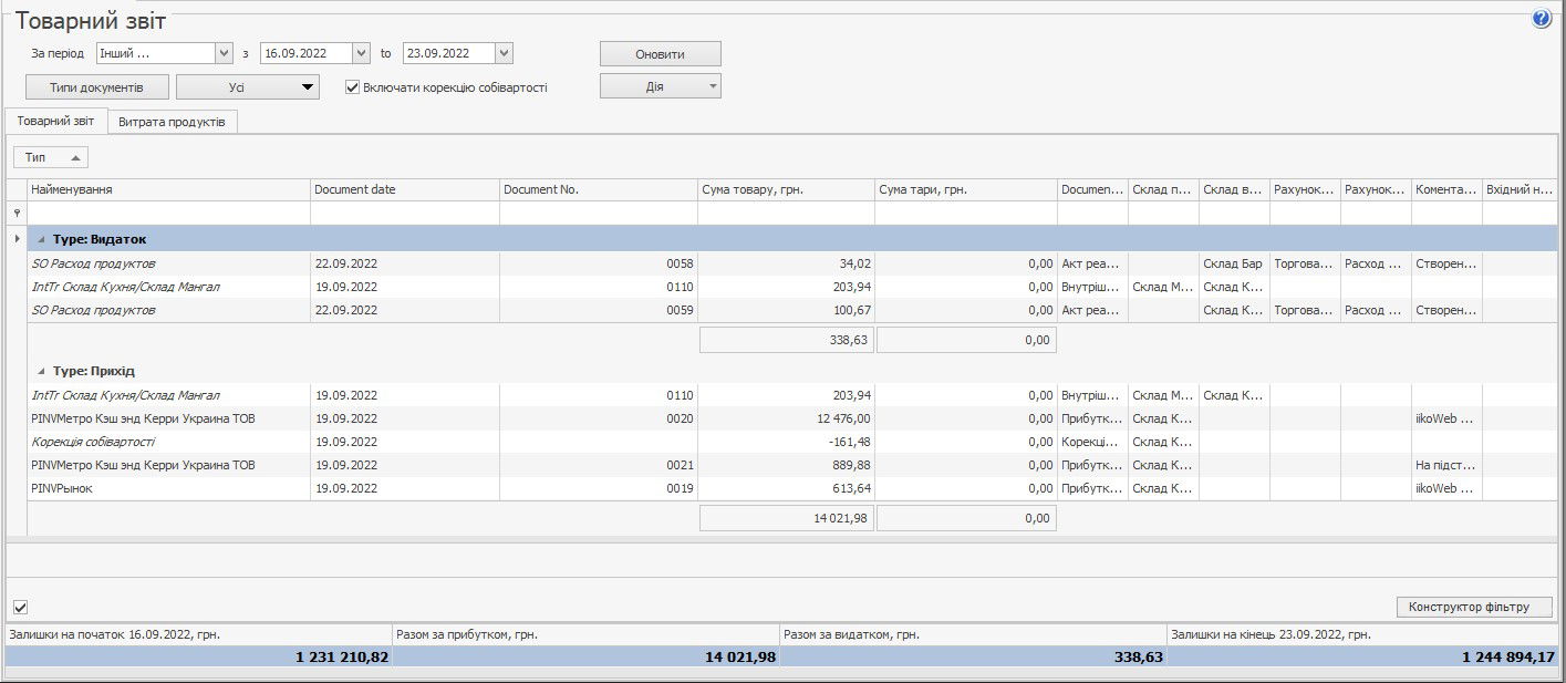 На відповідних вкладках формуються Товарний звіт і дані щодо Витрати продуктів, виводяться підсумкові суми за надходженням і витратами та за кожною з обраної групи даних. Суми залишків на початок і кінець заданого періоду, підсумкові суми за приходом і витратою показані в нижній області вікна.