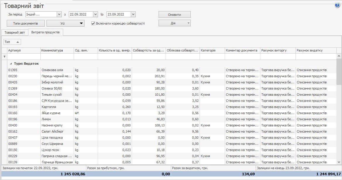 У вкладці Витрата продуктів представлена інформація про всі елементи номенклатури, за якими зареєстровано витрату і прихід за вказаний період на обраних складах. Для кожної номенклатурної позиції відображається її кількість і собівартість на початок і закінчення обраного періоду.