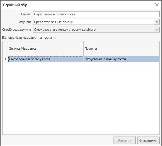 - Послуга "Округлення на користь гостя". Автоматично створюється в довіднику послуг, вибрати іншу не можна. Під час закриття касової зміни формується Акт приймання цієї послуги на суму відкинутих копійок.