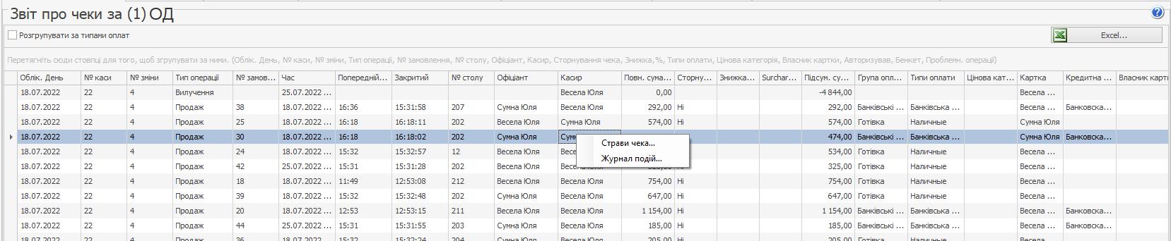 - Група оплати - тип оплати замовлення, за яким роздруковано чек: "Оплата готівкою", "Банківські картки", "Безготівковий розрахунок" або "За рахунок закладу".