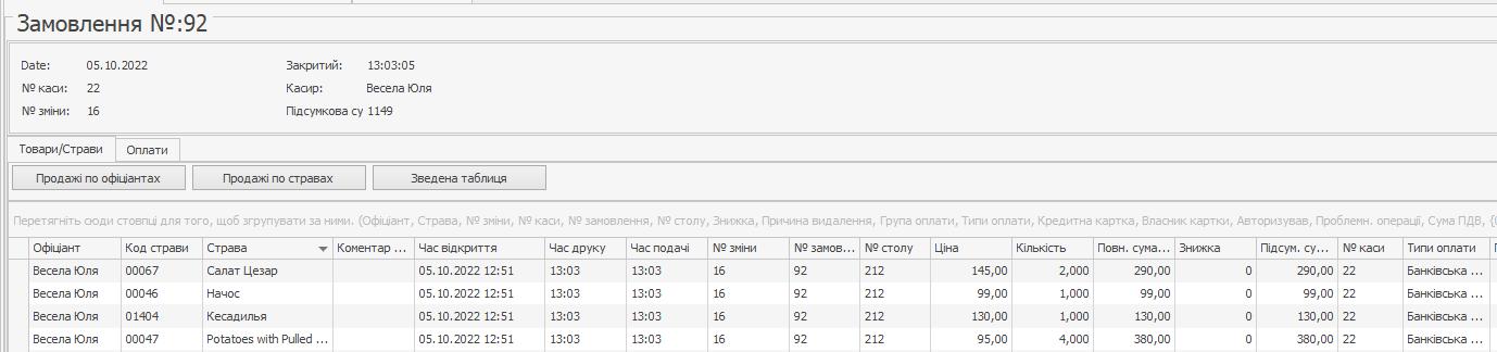Якщо виконати подвійне клацання мишею по запису, що відповідає чеку, або ж вибрати команду контекстного меню Страви чека, то відкриється вікно з деталізацією інформації про страви, що входили в замовлення, за яким було зареєстровано чек, і оплати, отримані за замовлення.