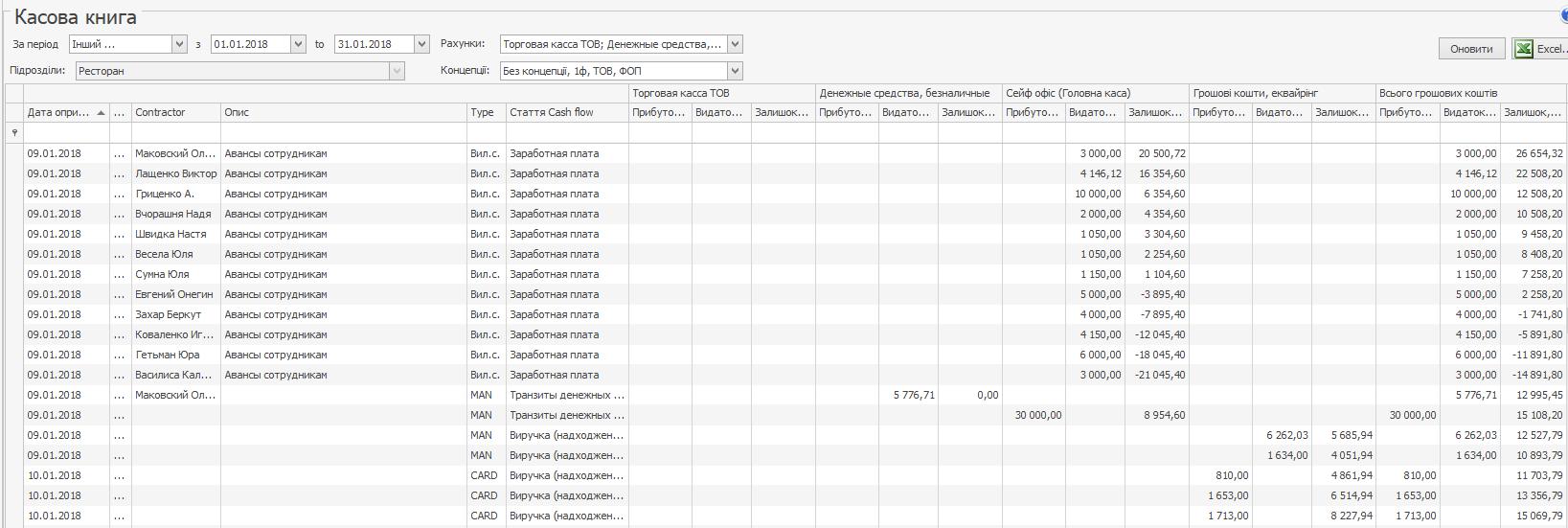 Перейдіть у Фінанси → Касова книга, виберіть підрозділ, задайте звітний період і натисніть кнопку Оновити. Будуть відображені операції, проведені в Syrve за рахунками з типом "грошові кошти". Можна відфільтрувати список операцій за потрібними рахунками та концепціями.