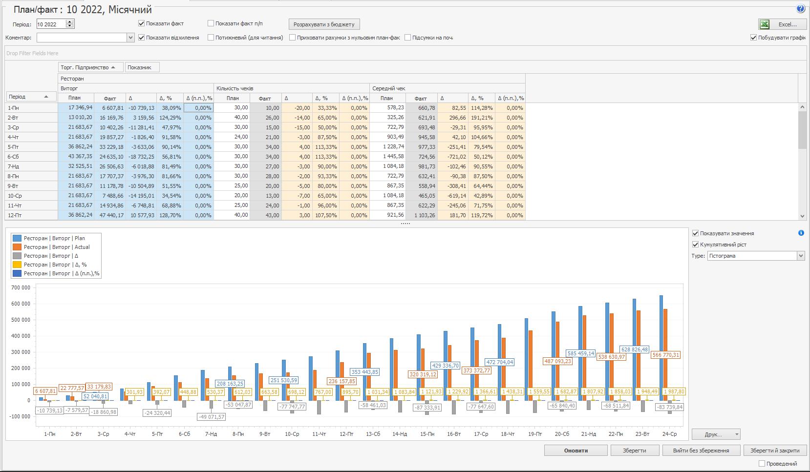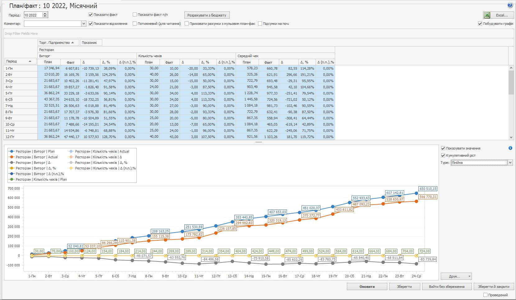 Графічне представлення даних за виручкою налаштовується за допомогою параметра Кумулятивне зростання. У разі ввімкненого параметра графік показує, як факт за виручкою "виконує" план у часі. У разі ввімкненого параметра Показувати значення на графіку показуються числові дані.
