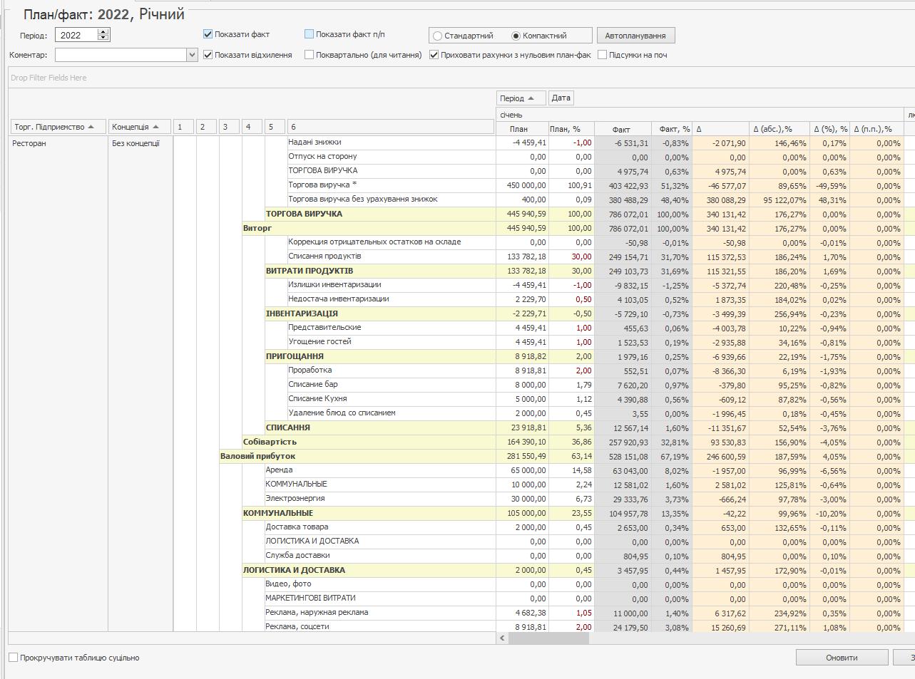 Налаштування план-факту відновлюються під час наступного сеансу роботи. Це стосується введених даних, встановлених фільтрів, сортування і групування, набору колонок.