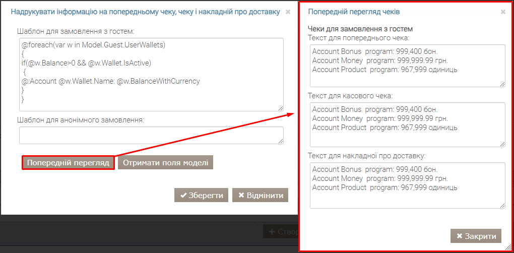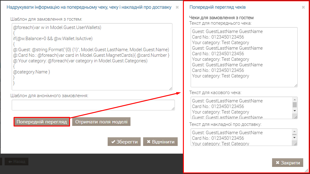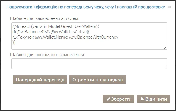 Щоб налаштувати такий шаблон, потрібно додати дію Надрукувати інформацію на попередньому чеку, чеку і накладній про доставку та в полі Шаблон для замовлення з гостем вказати наступний шаблон: