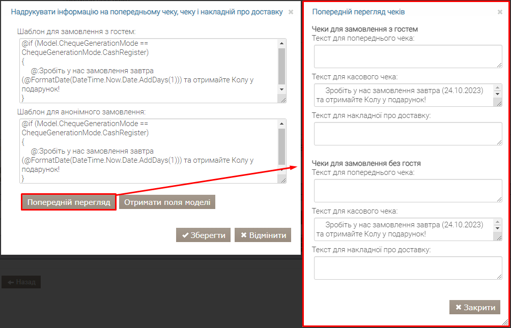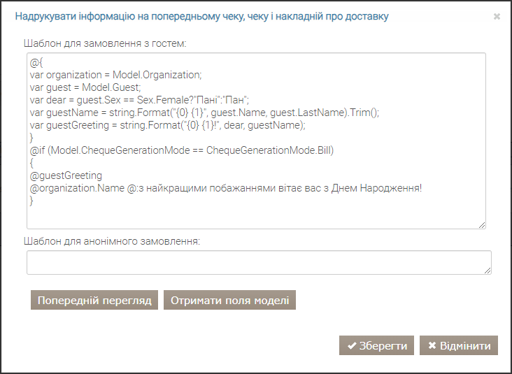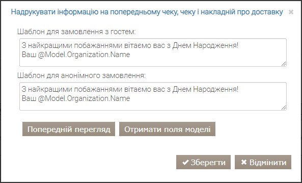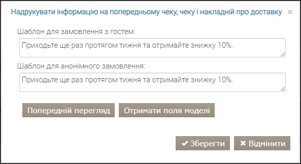 Повідомлення, надруковане на чеку, гостьовому рахунку чи рахунку-фактурі, може бути простим текстом або шаблоном Razor.