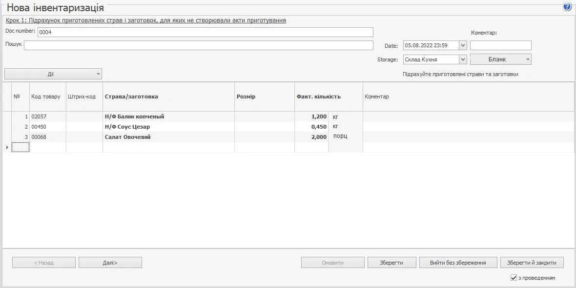 1. Підрахуйте напівфабрикати та готові страви, за якими ще не списувалися інгредієнти, та додайте їх до таблиці: виберіть найменування та вкажіть фактична кількість. Якщо страва продається у кількох розмірах, додайте окремий рядок для кожного розміру. До списку можна додати страви та напівфабрикати: