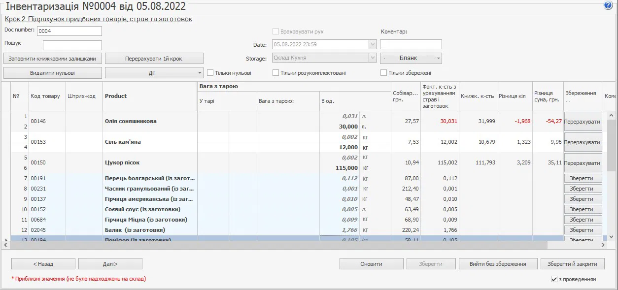 Якщо, наприклад, заднім числом будуть внесені виправлення в тех.карту будь-якої зі страв, що спричинить зміну обсягу списання її інгредієнтів, або ж будуть проведені будь-які документи по товарах, значення руху в документі інвентаризації автоматично змінено не буде. Її результати залишаться колишніми. Щоб врахувати ці зміни, необхідно буде перерахувати позицію – заповнити рух заново.
