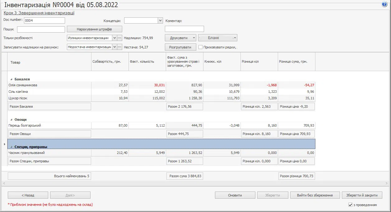Примітка: документ інвентаризації автоматично зберігається після підрахунку книжкових залишків хоча б за однією позицією.