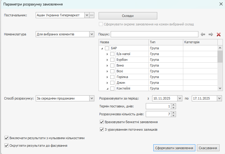 - Щоб у замовлення потрапили всі виділені товари, незалежно від підрахованої кількості, зніміть галочку Виключати результати з нульовими кількостями. За замовчуванням галочка встановлена, при цьому в замовлення не потрапляють товари, у яких кількість в результаті розрахунку вийшла рівною нулю.