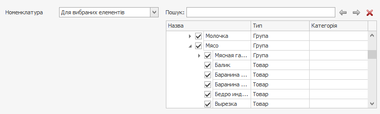 ● Для вибраних елементів. Для додавання в замовлення доступні всі елементи довідника номенклатури. Позначте галочками необхідні товари або групи.
