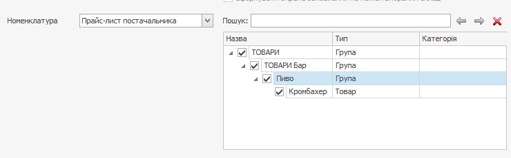 ● Прайс-лист. Для вибору доступні товари, що входять до прайс-листа обраного постачальника.