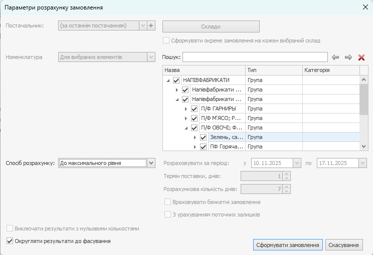 - До максимального рівня. Суть методу полягає в поповненні поточного залишку товару на складі до максимального рівня запасів. Якщо значення максимального рівня по товару не задано, то в замовленні кількість цього товару буде дорівнювати нулю. Якщо ви не вказали постачальника і вибрали цей метод розрахунку, то система визначить, у кого востаннє замовлялися вибрані товари. Для кожного такого постачальника буде сформовано замовлення, в якому кількість товару відповідатиме останній поставці від даного контрагента.