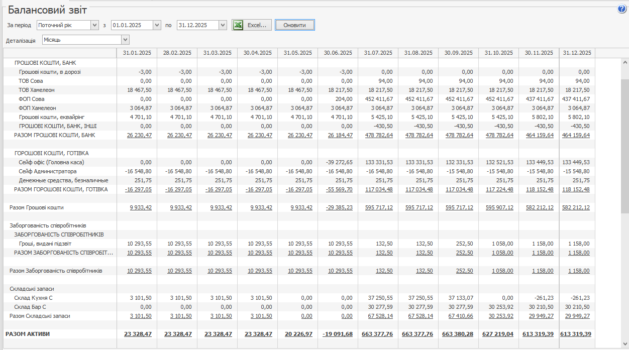 Для перегляду балансового звіту виберіть в меню Звіти (або Фінанси) пункт Балансовий звіт. Відкриється вікно, в якому ви зможете переглянути стан активів і пасивів вашого підприємства за певний період. За замовчуванням відображається звіт на кінець поточного місяця.