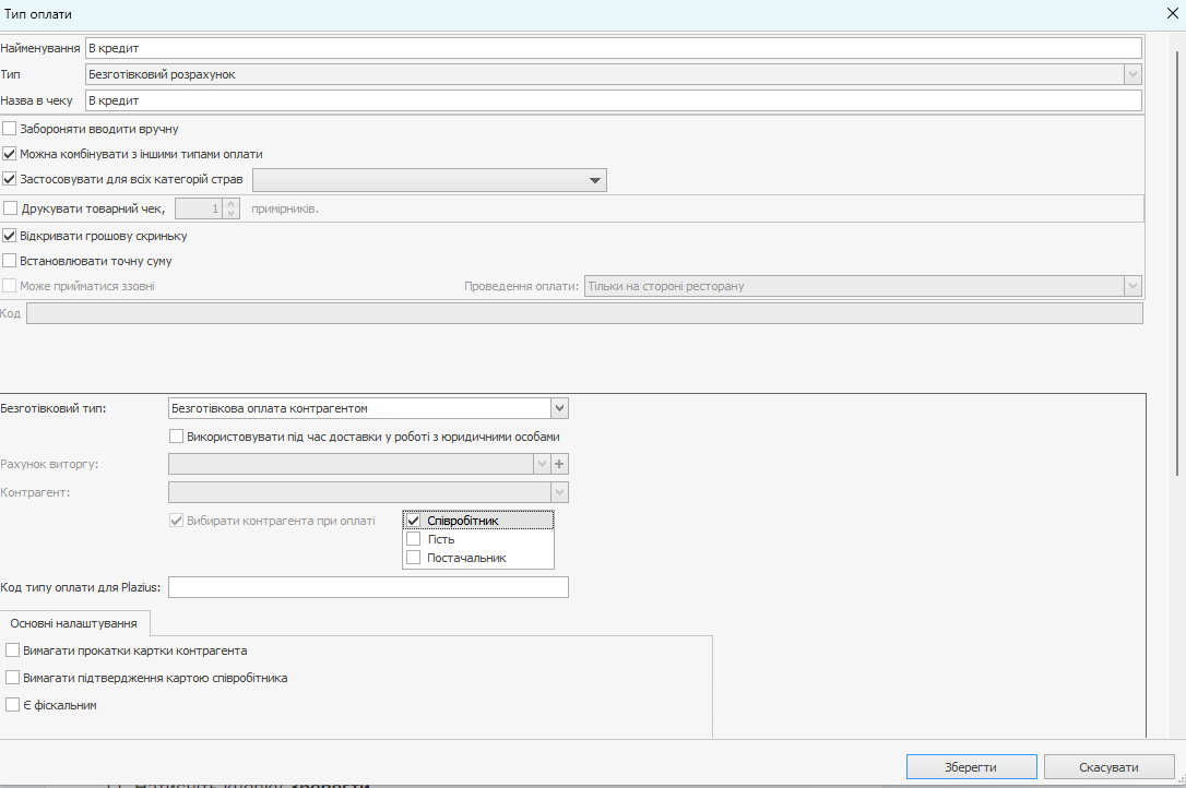 Щоб створити тип оплати в кредит співробітнику, гостю або постачальнику: