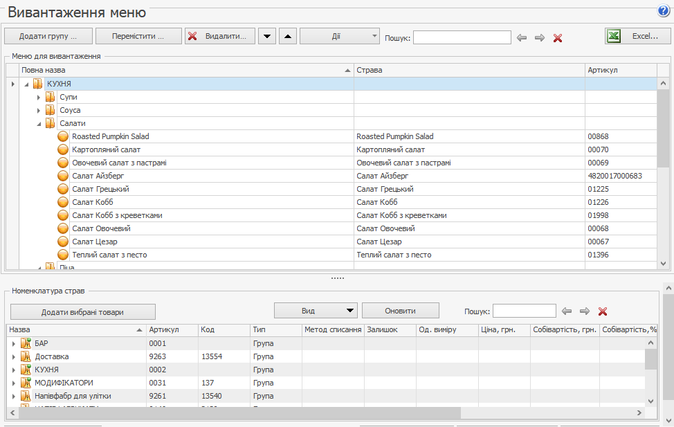 У меню, що вивантажується, розміщуються страви або інші елементи з номенклатурного довідника. Їх можна об'єднувати в групи і будувати структуру, яка відрізняється від стандартного довідника. Страви можуть мати інші назви і картинки, що відрізняються від зазначених у номенклатурних картках.