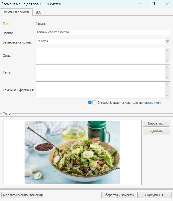 - Поля Назва та Опис підставляються з номенклатурної картки страви. Їх можна змінити, але потім вони не будуть синхронізуватися з карткою. Щоб при редагуванні назви або опису в картці зміни відображалися і в зовнішньому меню, встановіть галочку Синхронізувати з карткою номенклатури.