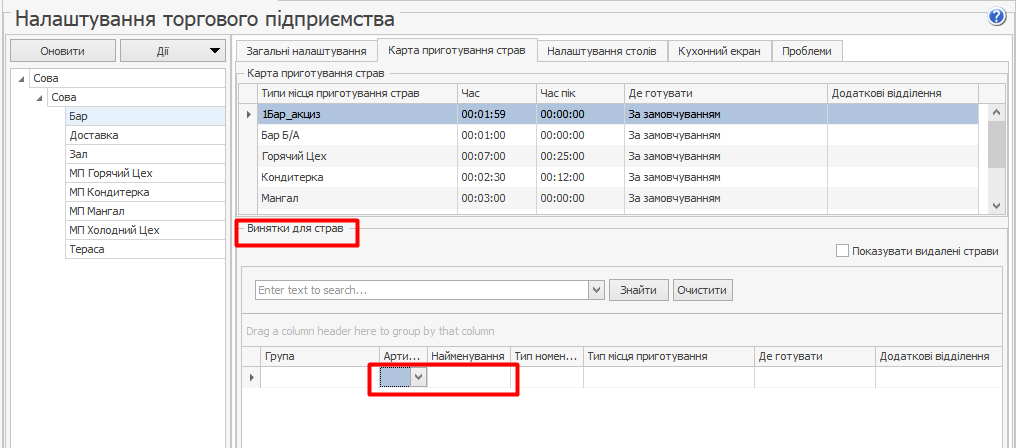 Щоб змінити місце приготування для однієї конкретної страви, додайте її до списку винятків у блоці Винятки для страв. Для цього натисніть на порожній рядок у таблиці та виберіть страву за артикулом або назвою у стовпцях Артикул або Найменування.