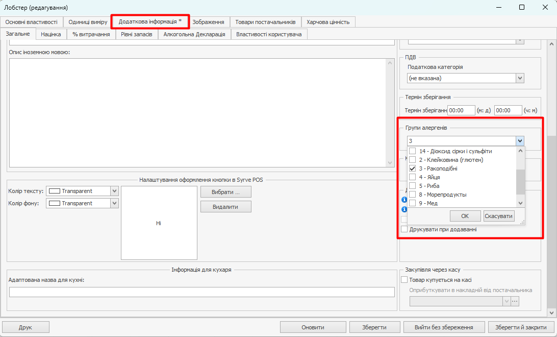Алергени, що містяться, можна вказати в будь-якому елементі номенклатури, крім послуг і тарифів, на вкладці Додаткова інформація в полі Групи алергенів.