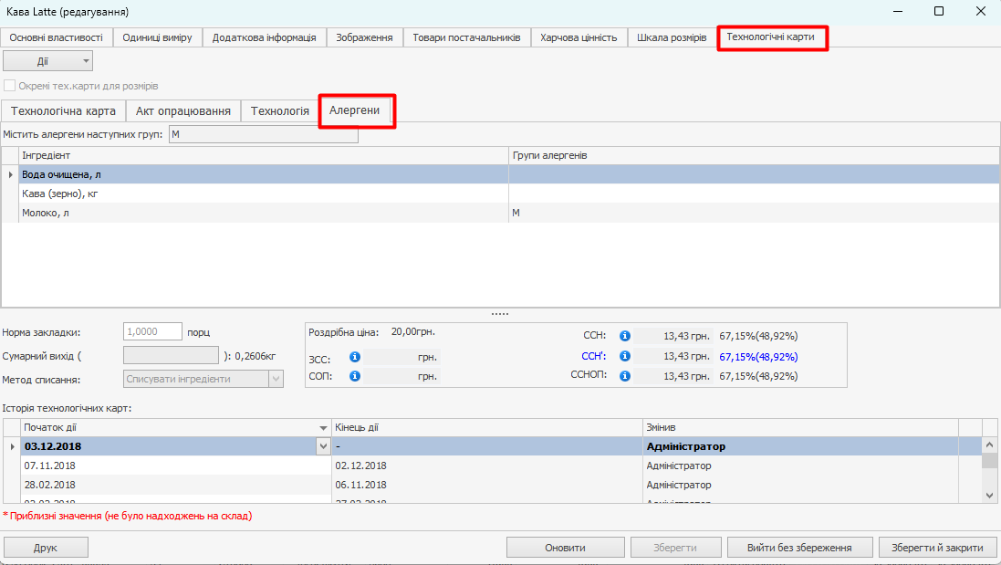 Список алергенів страви можна переглянути в її картці на вкладці Технологічні карти → Алергени: