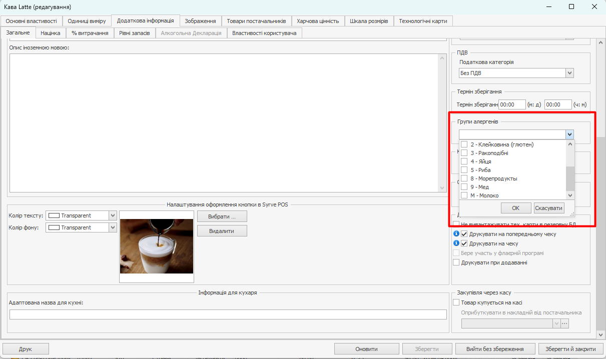 Касир може повідомити гостю, що в страві містяться небезпечні для нього інгредієнти. Для цього в Syrve POS страва з алергеном позначається значком