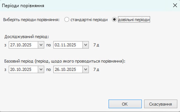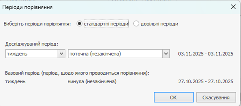 ◌ Стандартні періоди. Досліджуваним періодом може бути поточний або попередній тиждень, місяць, квартал, рік. Базисний період система визначає автоматично залежно від досліджуваного. Якщо досліджується поточний тиждень, то порівнювати його будуть з попереднім. Якщо обрано попередній місяць лютий, то його порівнюватимуть із січнем.
