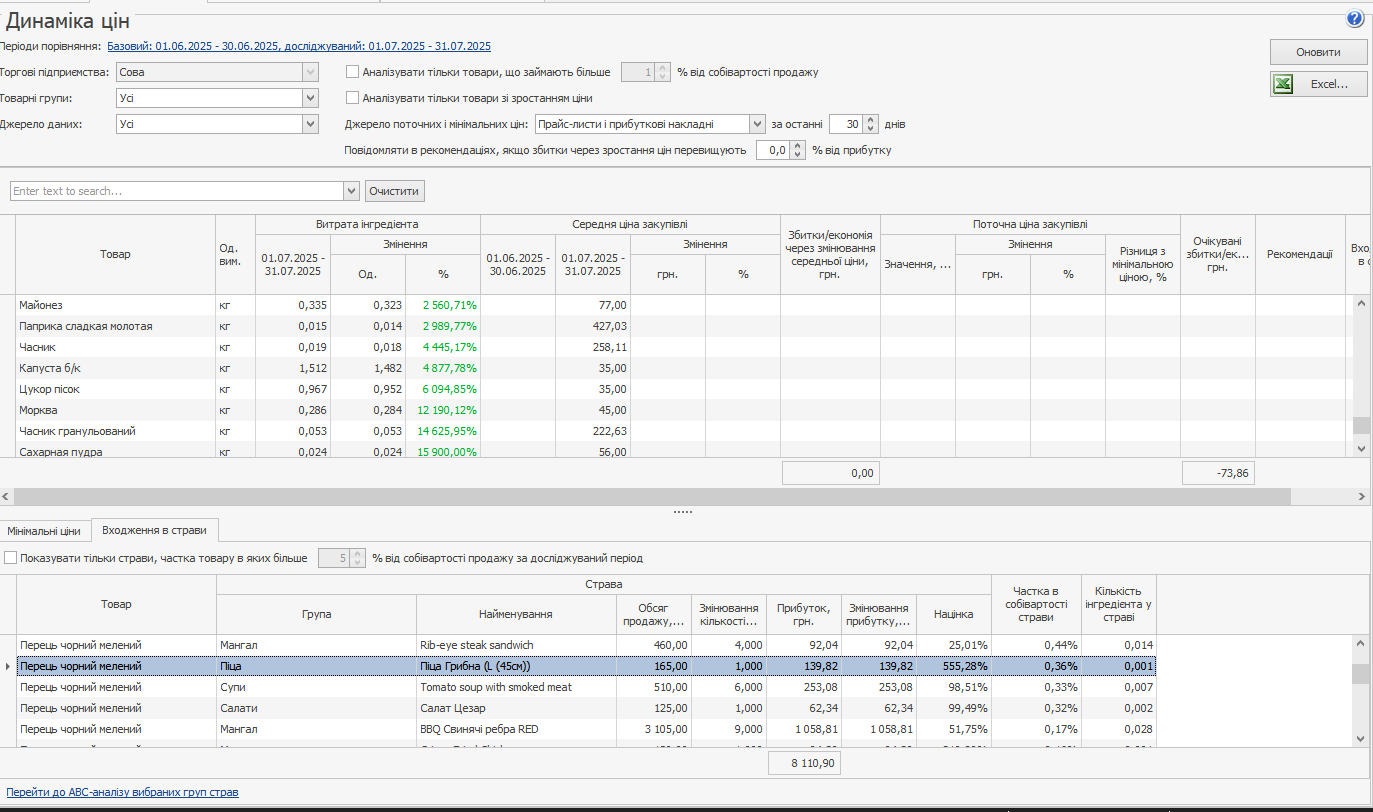 • Витрата інгредієнта — обсяг списання товару за досліджуваний період і як він змінився порівняно з попереднім періодом.