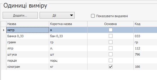 Одиниця виміру, навпроти якої в полі Основна стоїть галочка, задається за замовчуванням при створенні нового елемента номенклатури.