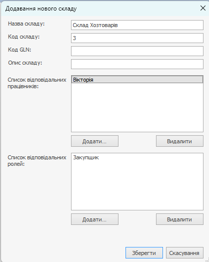 заповнити персональну картку на співробітника, відповідального за цей склад (у тому випадку, якщо цей співробітник з якихось причин ще не заведений в систему). Натиснувши кнопку