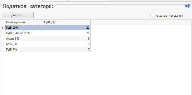 Розділ Податкові категорії призначений для створення ставок податку на додану вартість, які в подальшому використовуються в налаштуваннях обліку торгового підприємства: при налаштуванні типів замовлень, номенклатури, створенні податкової категорії за замовчуванням тощо. Детальніше про налаштування обліку на підприємстві дивіться в статті Налаштування обліку.
