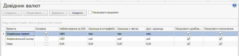 Її можна редагувати, але не можна видалити. Решта створених вами валют є додатковими.