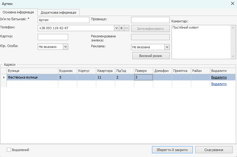 ◌ Поля Юр.особа, Реклама та Високий ризик використовуються в службі доставки. Детальніше див. статтю Довідник клієнтів.
