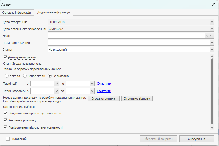 ◌ Поля Дата створення та Дата останнього замовлення заповнюються автоматично і недоступні для редагування.