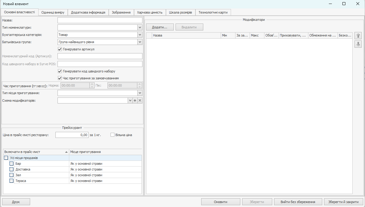 Для товарів також повинна бути задана харчова цінність, на основі якої буде розраховуватися харчова цінність тих страв, до складу яких вони входять. Для страв, заготовок і модифікаторів також формуються технологічні карти, де задається склад інгредієнтів і порядок їх приготування.