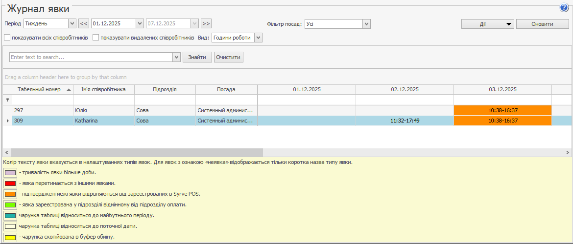 Журнал явки – це таблиця, в якій в рядках розташований список співробітників, а в стовпцях – календарні дати. Комірки таблиці містять явки співробітників у форматі, який обрано в полі Вид: