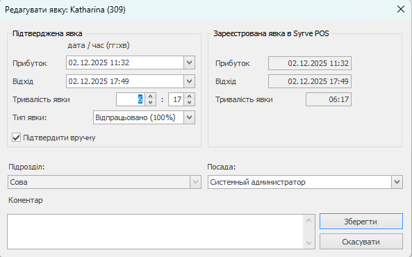 Таким чином, за допомогою ручної реєстрації явки менеджер (або інша відповідальна особа) може зарахувати, скоротити, збільшити або не зарахувати переробку, зафіксовану в Syrve POS, а також перевизначити за фактом тип явки співробітника.