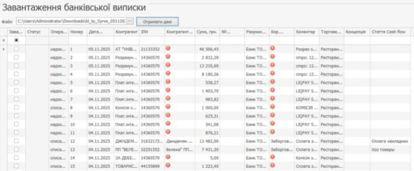Syrve дозволяє користувачам імпортувати виписки з рахунків, створені в програмному забезпеченні для онлайн-банкінгу. У цьому випадку кредитні та дебетові операції по рахунку будуть автоматично зареєстровані в системі.