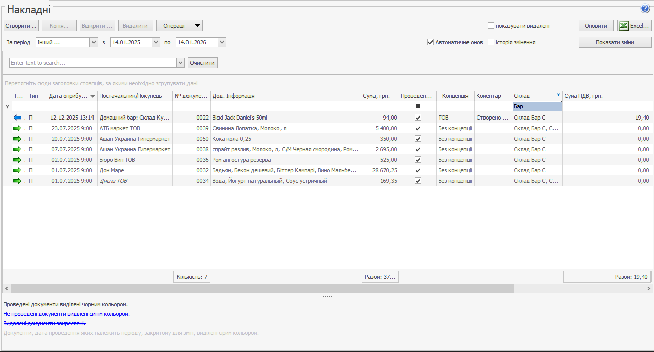 Якщо після перегляду накладної хочете залишити її в первісному вигляді, натисніть кнопку Вийти без збереження. Якщо ви внесли зміни, натисніть кнопку Зберегти і закрити. За замовчуванням накладна буде збережена з перепроведенням, тобто зміни будуть застосовані. Якщо ви хочете скасувати проведення будь-якої накладної, відкрийте її, зніміть галочку з перепроведенням і натисніть кнопку Зберегти і закрити.