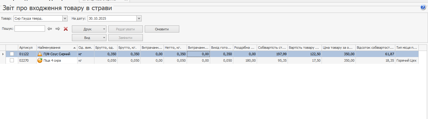 Для отримання звіту виберіть пункт меню Товари та склади → Звіт про входження товару в страву, потім виберіть товар, що вас цікавить, і натисніть кнопку Оновити. По кожному продукту наводиться інформація про його найменування, вагу брутто і нетто, відсотки втрат при холодній і гарячій обробці та собівартість відповідно до його технологічної карти.