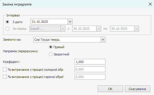 Цей звіт дозволяє також здійснювати групову заміну будь-якого інгредієнта у всіх стравах, до складу яких він входить. Для цього:
