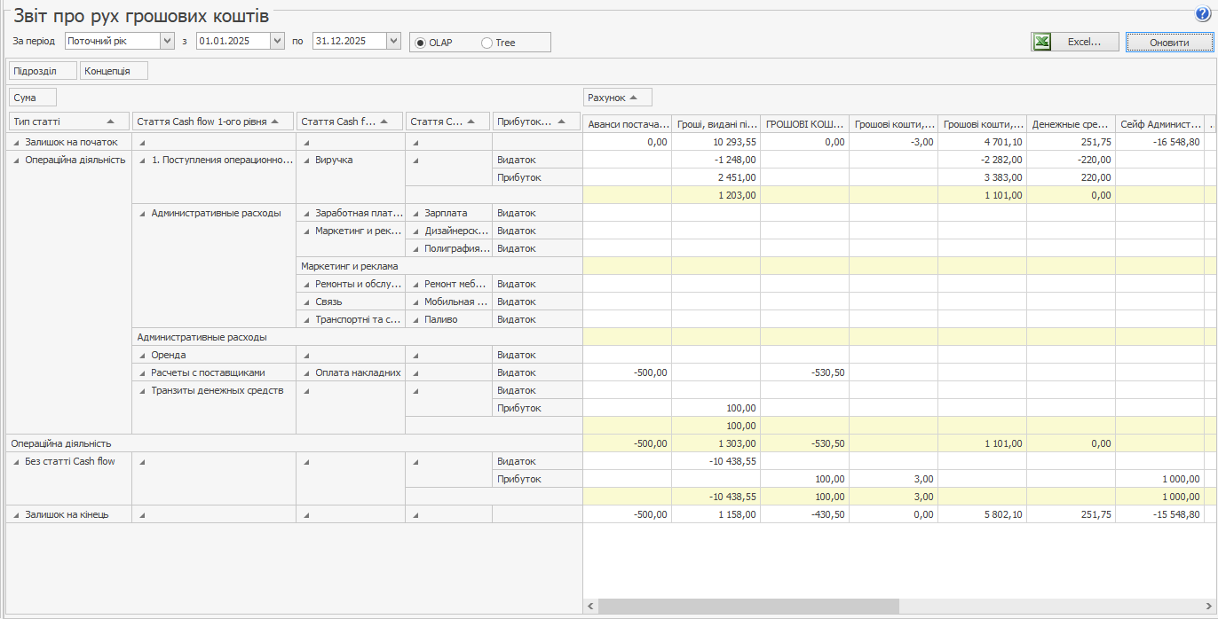 Щоб переглянути більш детальну інформацію про операції по рахунку, двічі клацніть по комірці з сумою обороту у відповідній колонці. В результаті відкриється картка рахунку. У ній дані будуть відображені з урахуванням деталізації (за підрозділами, концепцією та статтею Cash Flow), заданої у звіті.