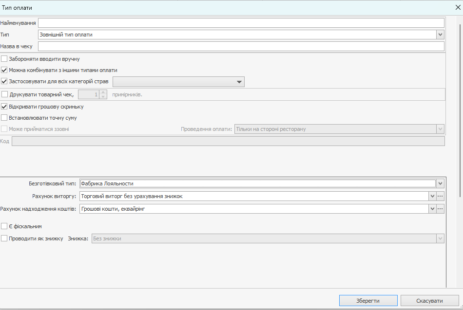 - У полі Рахунок виторгу вкажіть рахунок, на який буде надходити виторг з цього типу оплати. Для вибору доступні рахунки з групи «Доходи/Витрати».