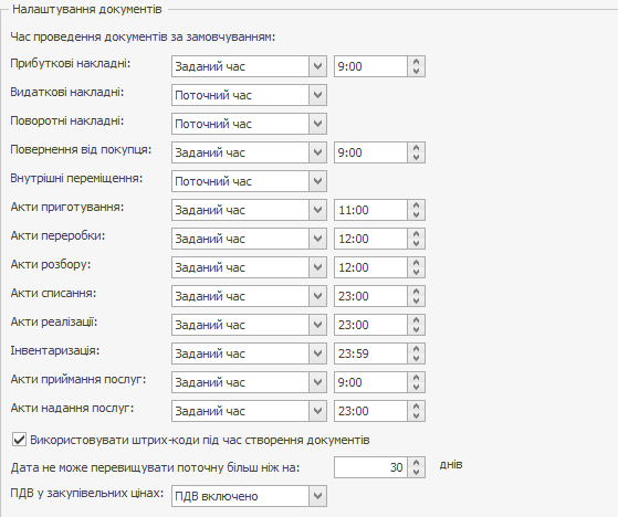 Для кожного виду документа можна вибрати один із варіантів налаштування часу проведення: