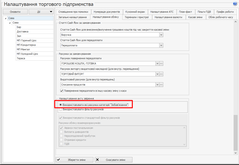 Задавати налаштування торгового підприємства у закладці Налаштування обліку може працівник із правами Налаштування обліку (з Адміністрації) (B_EAS) та Закривати період (B_CCLP). Він не повинен бути адміністратором із правом Адмініструвати систему (B_ADM).