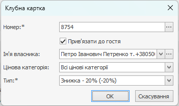 Для підвищення лояльності постійних гостей їм можуть бути видані дисконтні (клубні) картки, за якими їм буде надаватися знижка при оплаті замовлень. Щоб зареєструвати таку картку в системі: