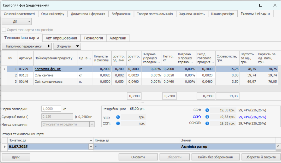 Всі показники собівартості страви (ЗСС, СОП, ССН, ССНОП) автоматично калькулюються внизу. Приклад їх розрахунку наведено в статті Приклад розрахунку собівартості.