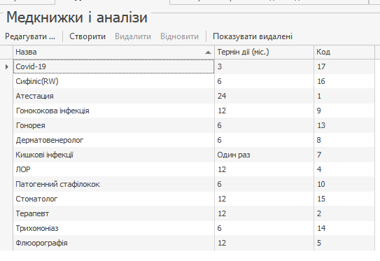 У системі передбачений стандартний набір аналізів, який ви можете знайти в розділі Співробітники → Довідники → Медкнижки та аналізи.